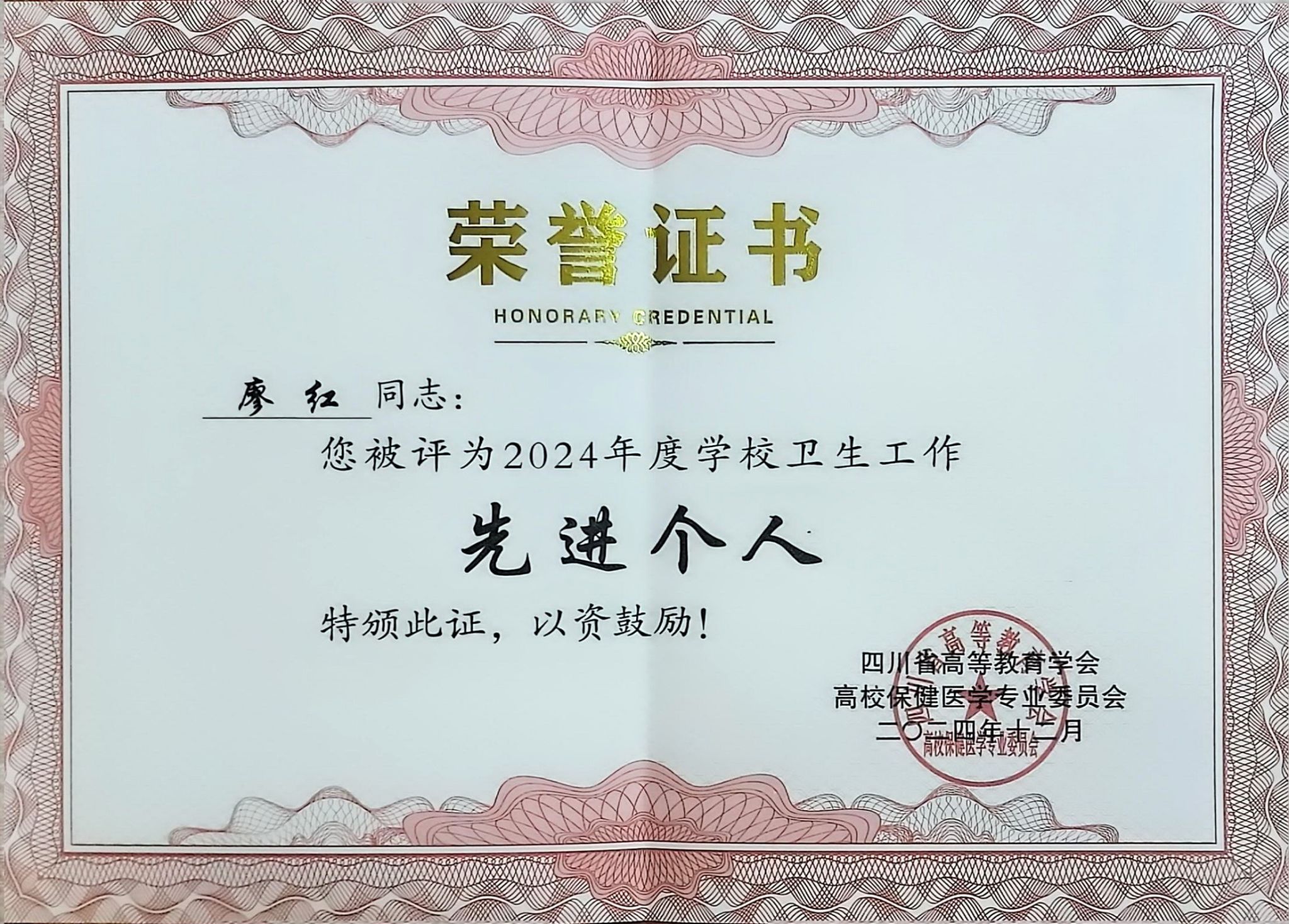 近日,四川省高等教育学会高校保健医学专业委员会对四川大学、电子科技大学等全省29所高校授予“2024年度学校卫生工作先进单位”,并对32名“2024年度学校卫生工作先进个人”予以表彰。乐山职业技术学院荣获“2024年度学校卫生工作先进单位”,廖红荣获“2024年度学校卫生工作先进个人”。