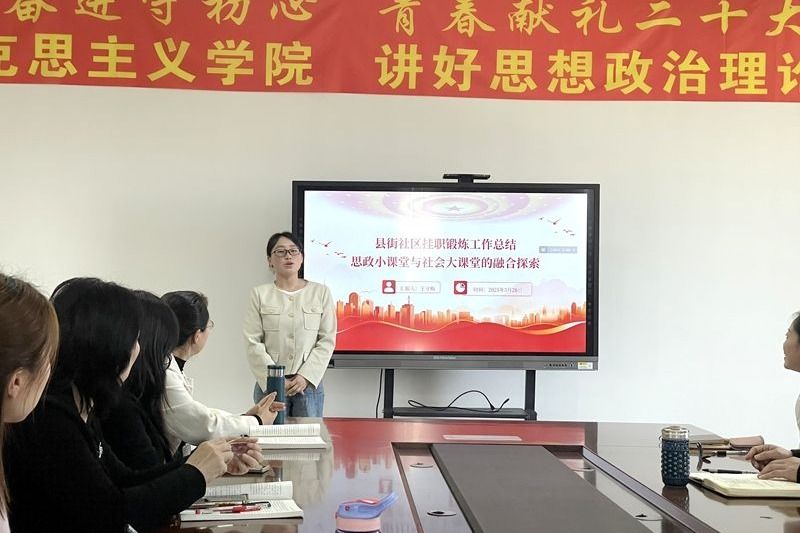 2025年3月26日下午2:00,马克思主义学院在1号教研楼410会议室举办“实践归来话收获”总结交流会。王守梅老师就上一学期在市中区海棠街道县街社区挂职锻炼作实践活动分享,全体教师参加。