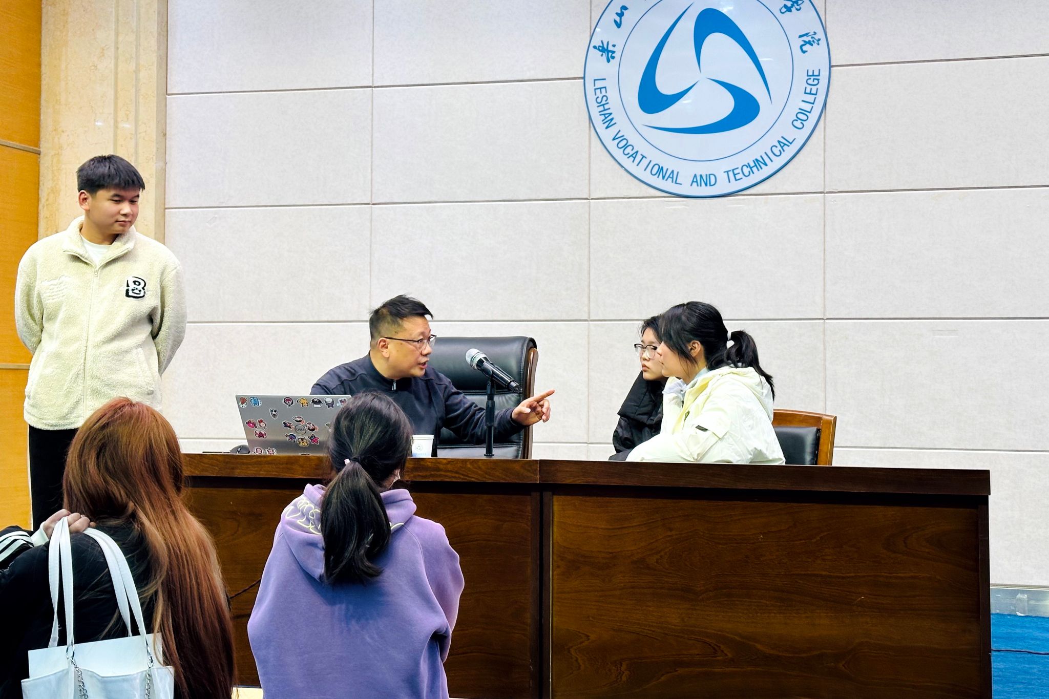 在互动环节,王海东通过古诗词诵读、绕口令挑战、句段练习等多种形式,寓教于乐,让现场氛围更加活跃。同学们在轻松愉快的氛围中积极参与,不仅锻炼了发音技巧,更深刻体会到了正确发声与精准表达的重要性。