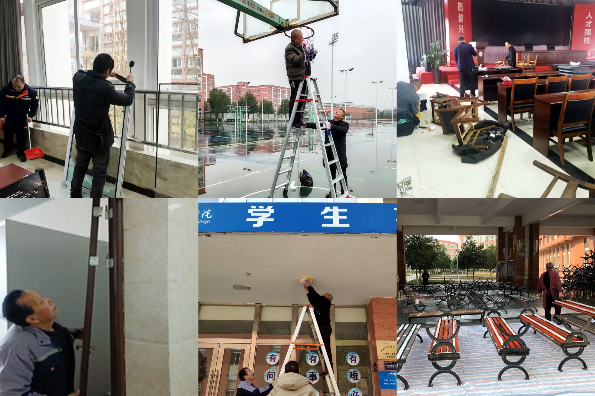 维修了教室及宿舍桌椅、体育设施设备等,检修了教学电子白板、照明灯,配备了粉笔、卫生工具等,清洗了开水器、空调滤网以及学生宿舍的房间窗帘等。