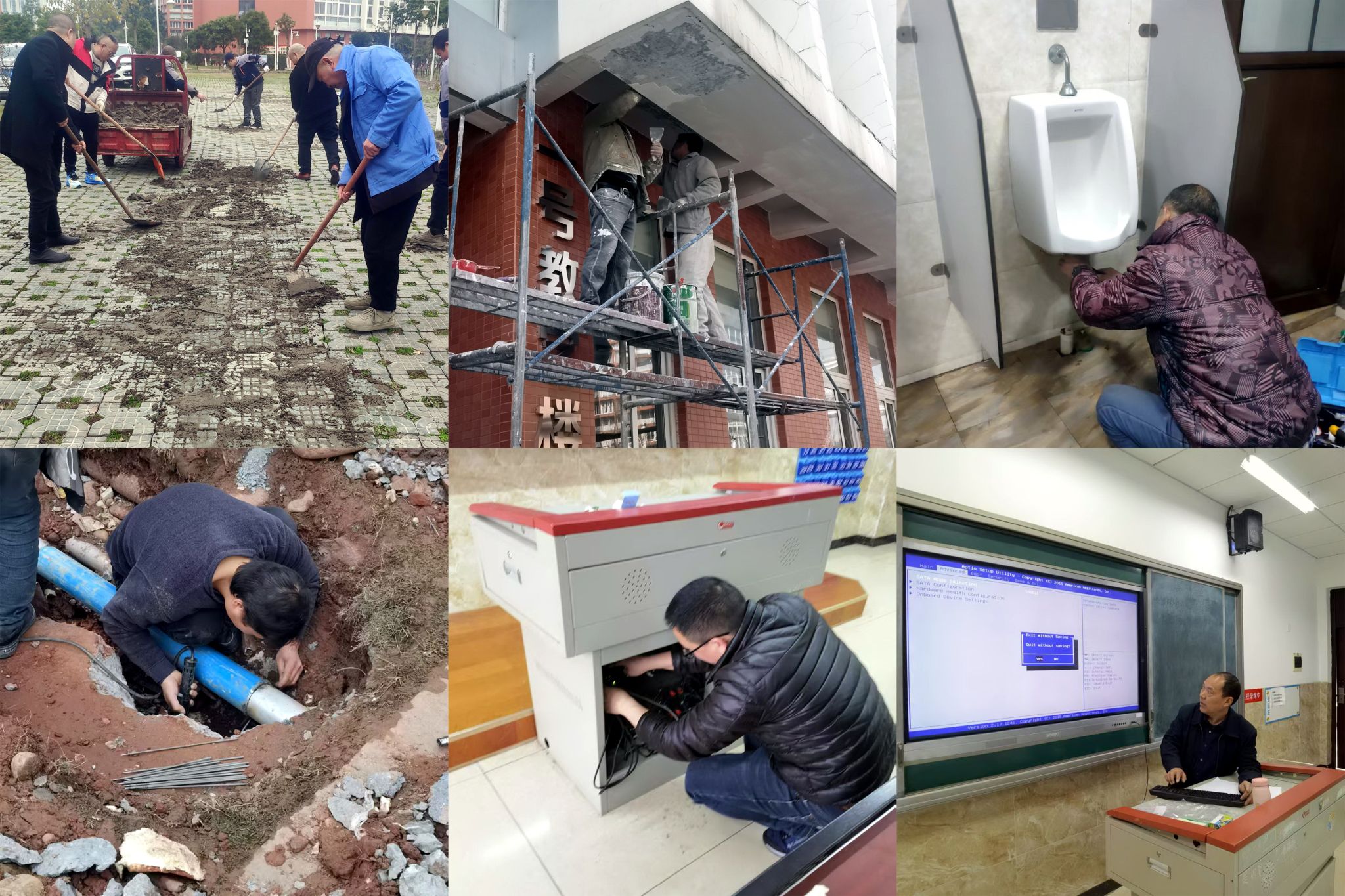 检查并维修维护校园剥落的墙面、破损的路面、脱落的瓷砖,组织对高压配电、电梯设备进行维护保养,联系燃气公司对学校燃气安全使用做全面检查,维修维护锈蚀的燃气管道。
