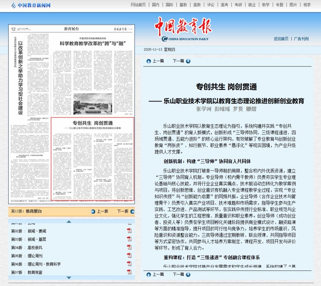 深耕职教沃土,厚植创新基因。乐山职业技术学院立足教育生态理论,以“专创共生、岗创贯通”为核心,搭建协同育人平台、完善课程体系、贯通实践场域,破解育人难题、赋能学生成长,走出了一条独具特色的高职创新创业教育之路。诸多成果落地、品牌效应凸显,这份育人答卷,见证初心与坚守,更彰显担当与作为!11月13日,《中国教育报》以“专创共生 岗创贯通--乐山职业技术学院以生态理论推进创新创业教育”为题,对我校的创新创业教育工作成效和特色进行了详细报道。